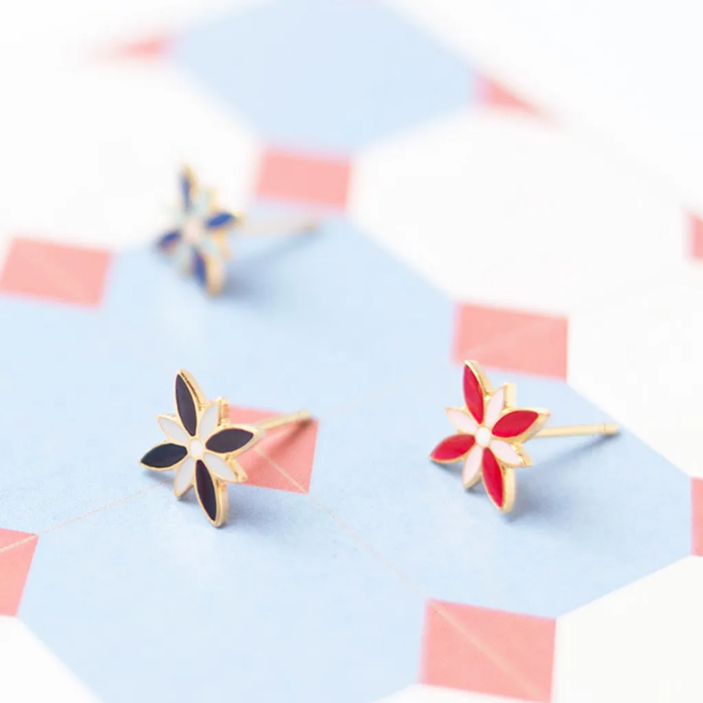 All jewelry pieces are handcrafted from hand cut brass, 24K gold plated, hand-painted enamel with surgical steel studs. Hypoallergenic.