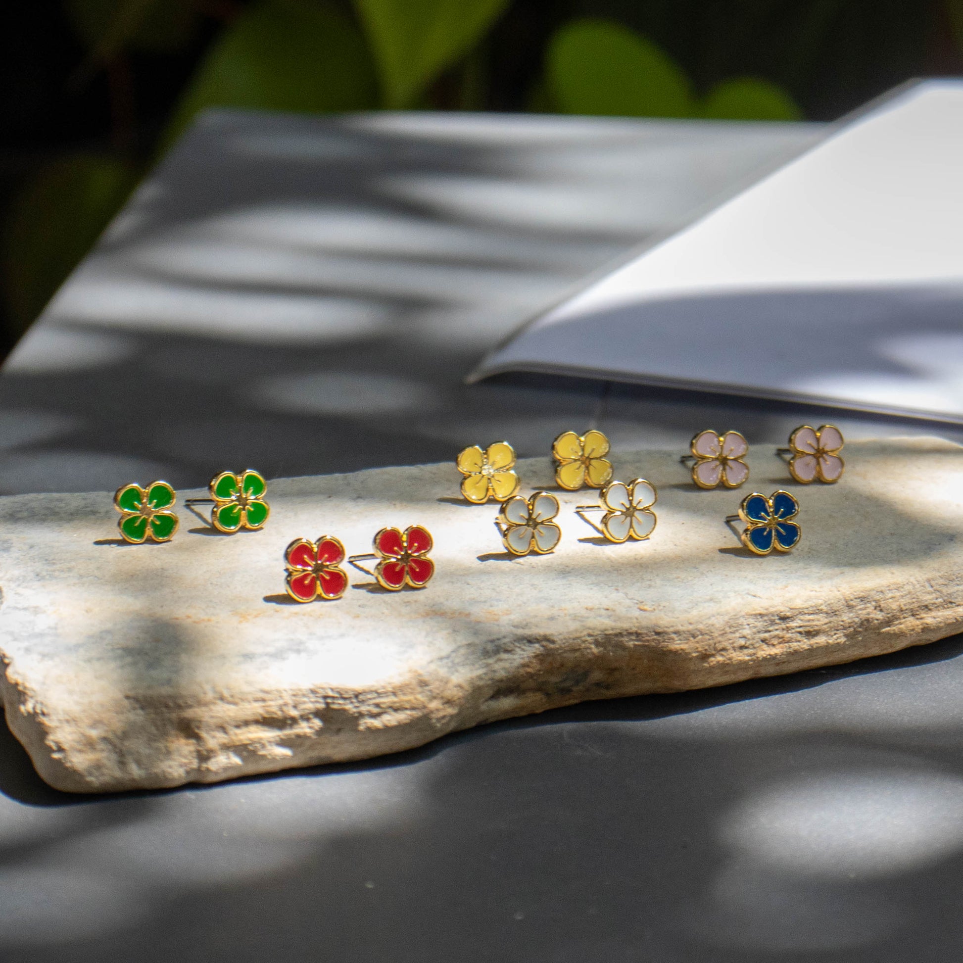 All jewelry pieces are handcrafted from hand cut brass, 24K gold plated, hand-painted enamel with surgical steel studs. Hypoallergenic.