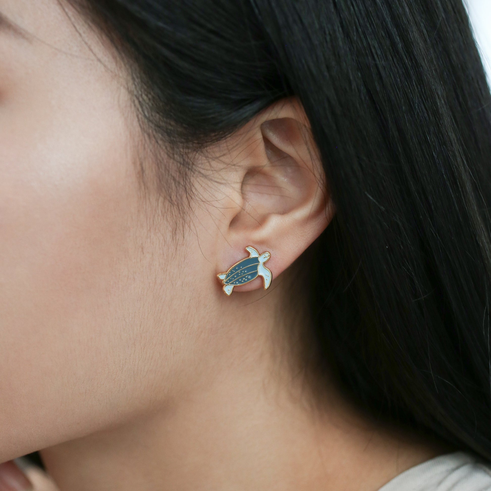 All jewelry pieces are handcrafted from hand cut brass, 24K gold plated, hand-painted enamel with surgical steel studs. Hypoallergenic.